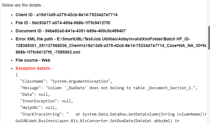 <p>BIS document exception :</p><p><br> "ClassName": "System.ArgumentException",<br> "Message": "Column '_DueDate' does not belong to table _Document_Section_1.",<br> </p>